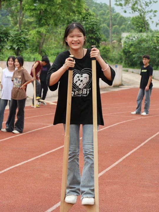 活动现场热闹非凡,学生们热情高涨,发挥勇于挑战的精神,积极参与踩高跷、三人足体育竞技比赛。